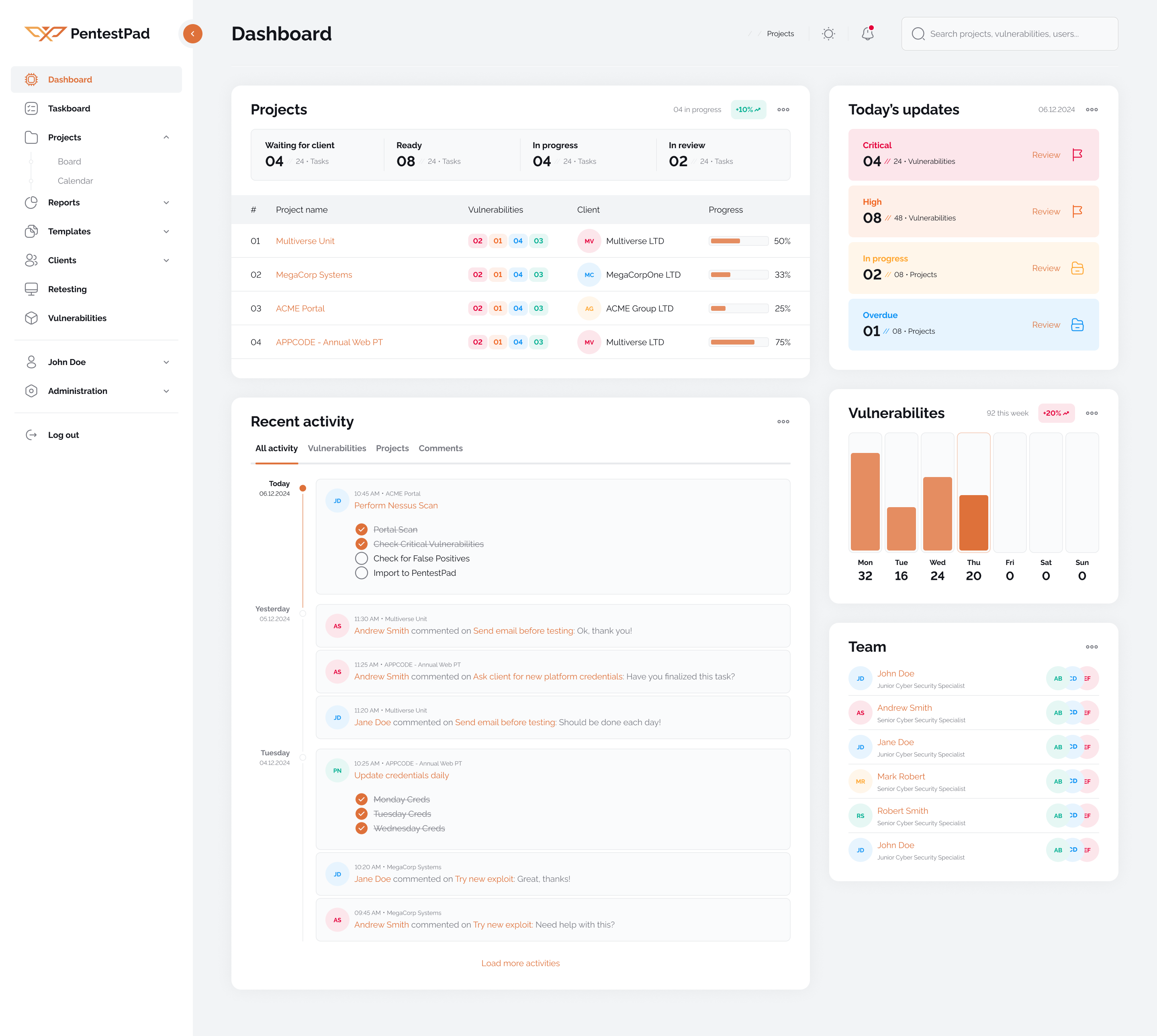 With a Kanban-style board, each vulnerability can be tracked through testing, review, retesting, and reporting. Your team can see exactly what’s done, what’s pending, who to ask and what needs attention.